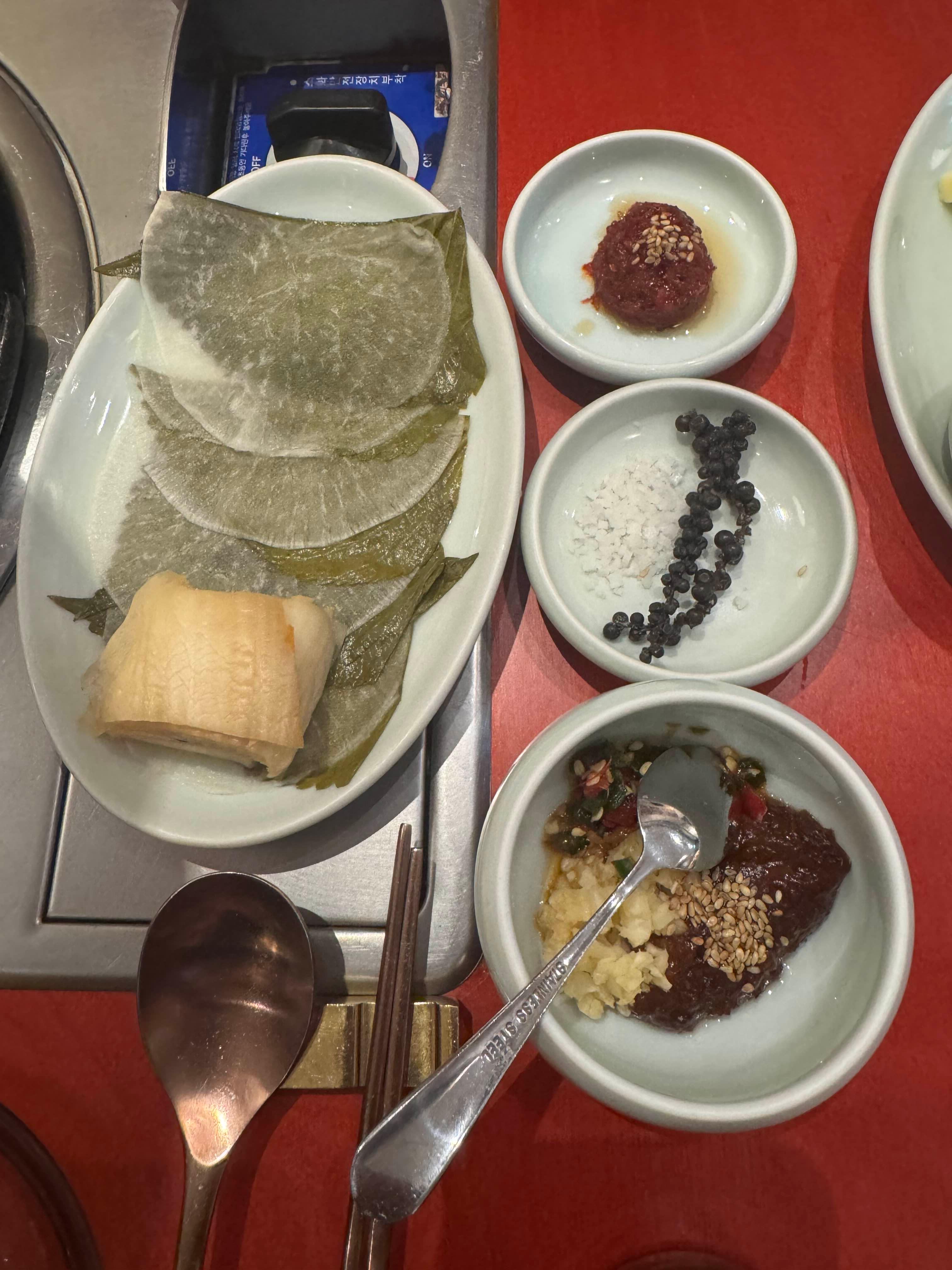 - 백김치, 파김치, 더덕무침, 젓갈 등 한국에서 공수한 반찬들